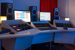 Meine Mastering Console in der Frontalansicht mit Bildmonitoren und Surround Abhöre.